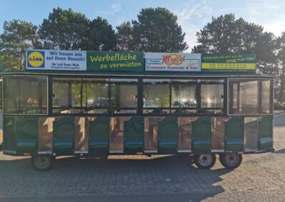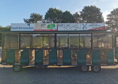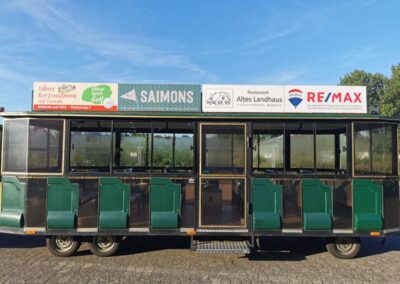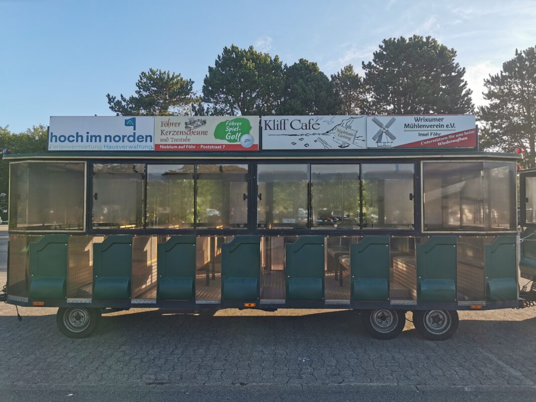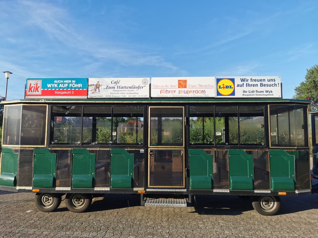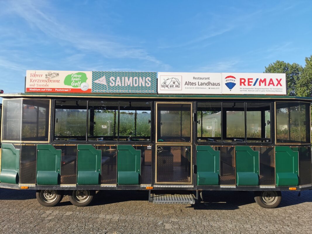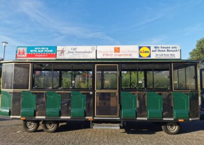 Tschu Tschu Wegebahn Bj. 2004/2005 mit 58 Plätze in 2 Anhängern ab April zu verkaufen oder zu verpachten. Der zweite Anhänger hat am Heck eine Rollstuhlrampe. Die Bahn ist insgesamt 19,30 m lang und 2,45 m breit, hat einen Wendekreis von 13 m. Jedes Fahrzeugteil wiegt 2,2 t und ist voll funktionsfähig. Die Lokomotive ist technisch auf ein Landrover Defender 2 TD5 mit 120 PS aufgebaut. Die Anhänger sind mit fast neuen Standheizungen ausgestattet und die Sprechanlage funktioniert über Headset, ein Anschluss von Tablet oder Handy ist auch möglich. Die Bahn wird gerade restauriert und lackiert.